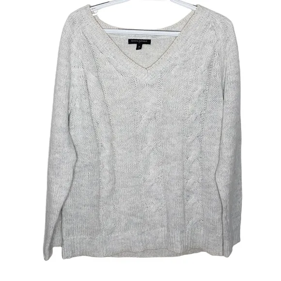 Banana Republic Factory tan cable knit v-neck sweater Great used condition, size M A wardrobe stapl... Show more