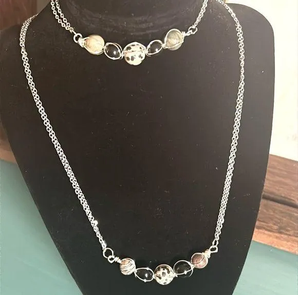 New Hand Crafted Artisan Wire Wrapped Gemstone Crystal Black Onyx, Picasso Jasper and Dalmatian Jasper Bead Curved Bar Necklace and Bracelet Set Stones are wire wrapped and set in silver tone double row chain with magnetic ball closure. Necklace 19.75” Bracelet 7” Due to lighting item’s color may vary slightly from pictures. Thanks for checking out my listing.