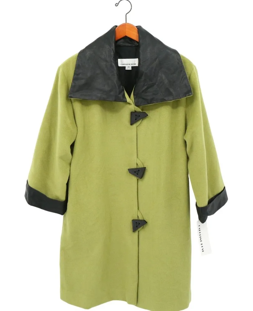 NWT Caroline Rose Green Black Faux Leather Trim Longline Jacket Coat Size: XS Funky buttons down f... Show more