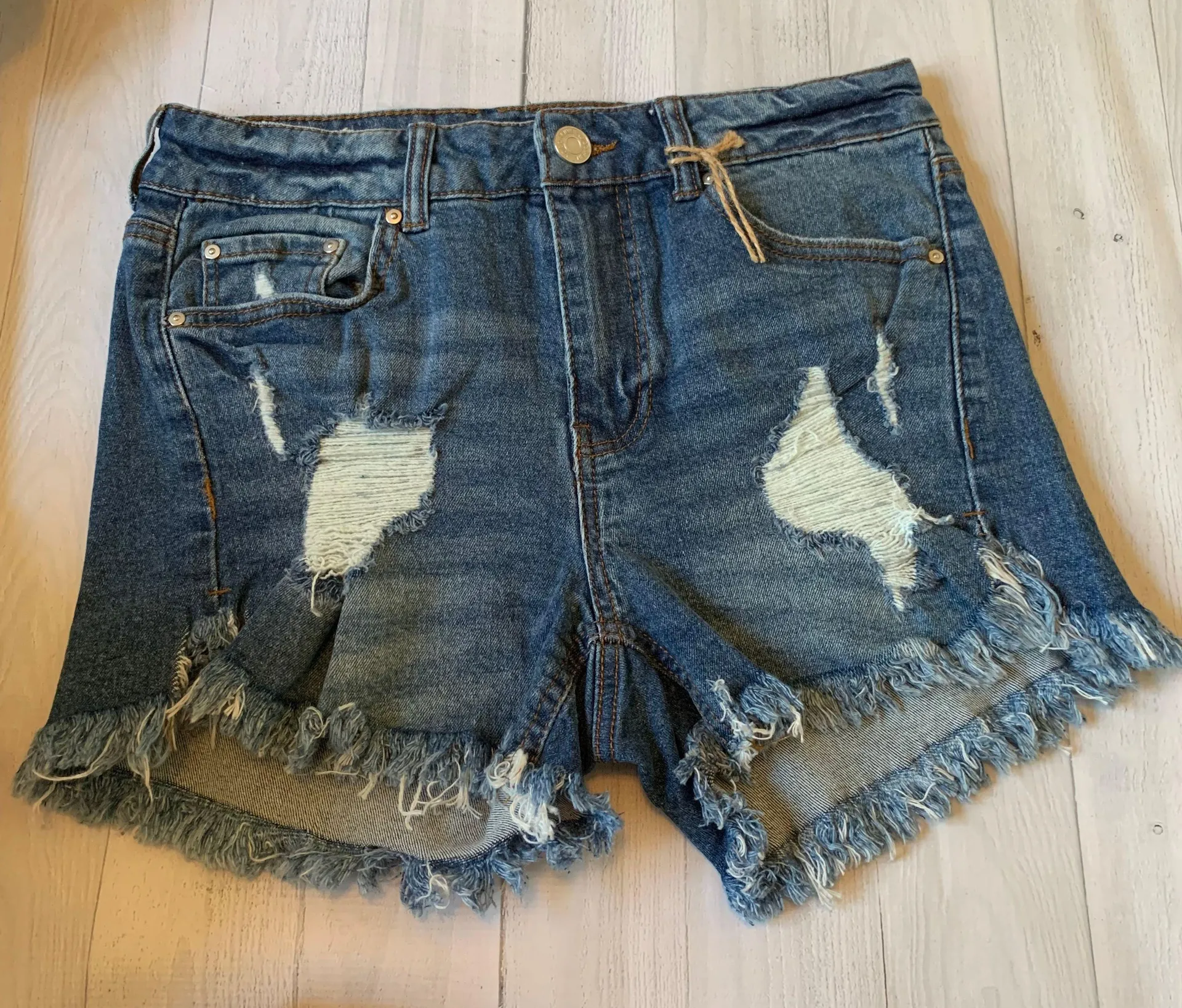 Picturing the Frayed Hem Jean Shorts from Indigo Rein in 5/26 Distressed Blue. •Brand: Indigo Rein... Show more