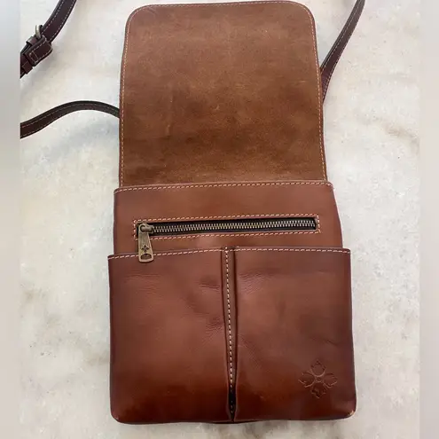 Excellent used condition- does have small flaws see photos 100% full-grain leather Interior: 1 zip pocket, 2 slip pockets; faux suede lining, 100% polyester Exterior: 1 zip pocket, 2 slip pockets under front flap, 1 rear slip pocket with magnetic snap closure, burned edge finish Front flap closure Signature brushed brass hardware, heavy handcrafted stitching Dimensions: 8 1/2" (W) x 9"(H) x 1"(D) Strap drop: 22" - 25"