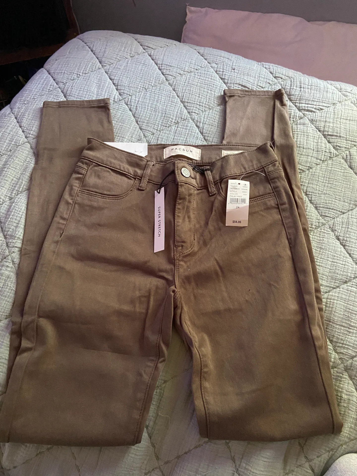 Very strechy and soft material. New with tags. Color is a very nice olive green. No rips