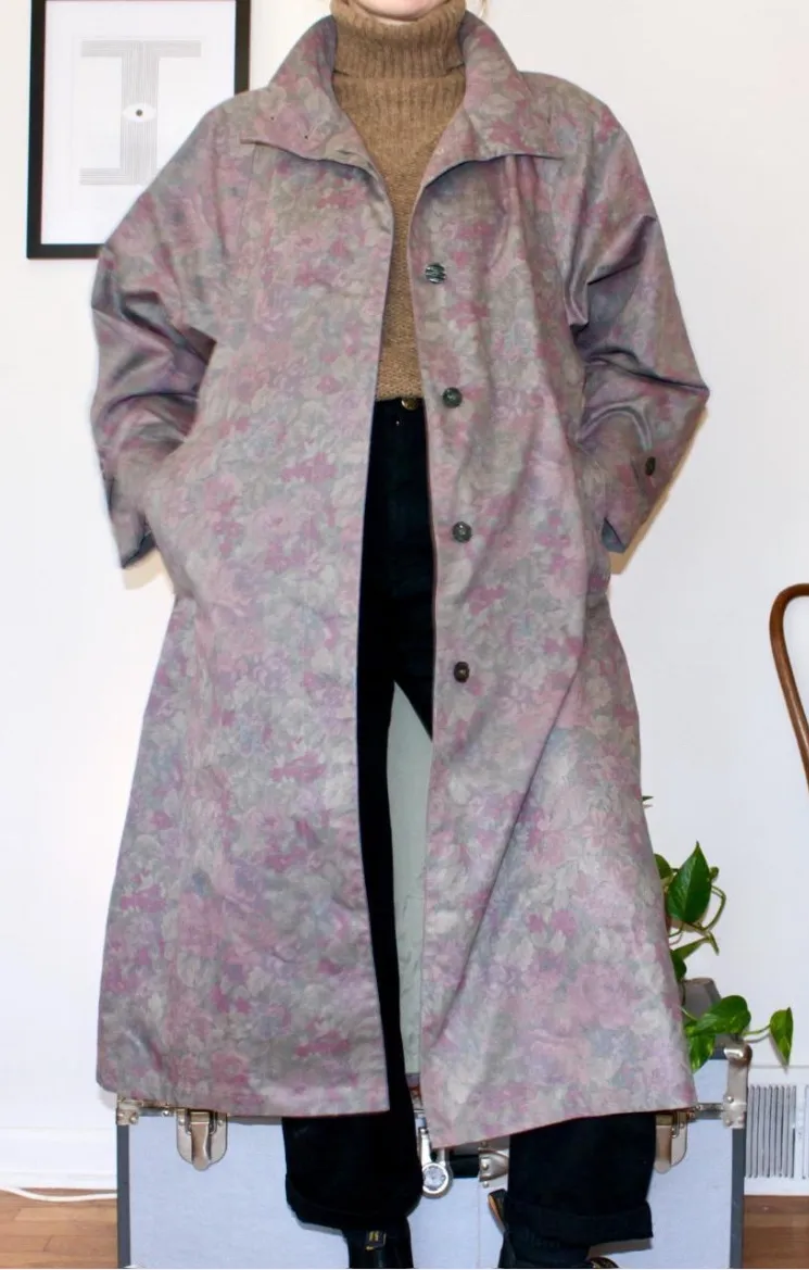The Memento Mori coat. 🥀🪞 USA made vintage 70s - 80s oversized floral trench coat in muted mauve and gray tones. obsessed with this wild haunted statement coat. It's giving archival Dries or Junya Watanabe. --DETAILS-- Slash pockets. Beltless. Shoulder pads (can be cut out if desired, msg after purchase) ACTWU union Made in USA. ❥BRAND- London Fog ❥MATERIAL- shell is 75% Fortrel polyester, 25% combed cotton. Fully lined in smooth, sage colored synthetic. ❥SIZE&FIT- tag women's 12 P. Looks killer oversized, OSFM • Shown on me, size XS-S, 5’8”, 120 lb --ᴍᴇᴀꜱᴜʀᴇᴍᴇɴᴛꜱ-- • chest 48" • sleeves (CB) 32" • length 47" ❥CONDITION- 9/10 excellent vintage condition. Tiny hole in right pocket. No other flaws found beyond typical wear. ---- #oversized #grunge #duster #vintagetrench #trenchcoat