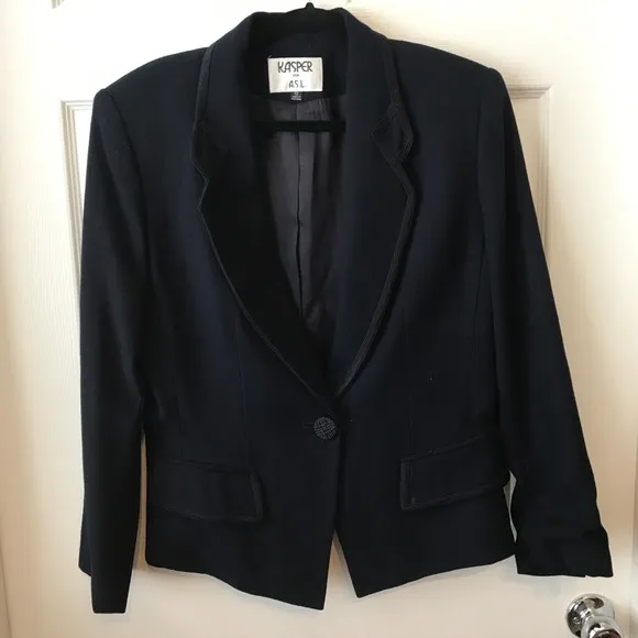 Sz 12 Navy Blazer Kasper for A.S.L. One Button EUC. Gorgeous quality - 100% wool - rare to find! Seriously, check competitors. Beautiful multi-strand piping all around - see photos - echoed in buttons detailing. Simply a high quality jacket that is timeless. No flaws, in EUC, ready to wear. Ask with questions! G