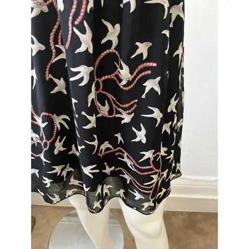 Pre owned 90s macy & taylor scoop neck strappy black dress Made in USA Black color with thin straps on both sides White dove and crane pattern all over Fully lined Slight elastic waist 100 percent polyester Size Small Bust 15.5 inches laid flat across Length 27 Inches Waist 12 inches laid flat across but has elastic and could stretch