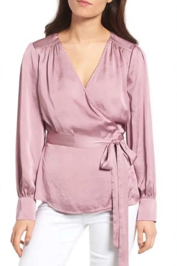 Details • Size Small • Beautiful mauvey blush pink color • Silky satin-like material • Adjustable wrap tie waist for a tailored look • Long sleeves with snap cuffs • Snap closure at neckline for secure wrap fit • Excellent condition – no flaws! Dress it up with skirts & heels or keep it casual with jeans — super versatile. 📦 Ships fast from a smoke-free home! 🎁 Bundle & save on shipping! Hashtags: #Chelsea28 #SatinTop #WrapBlouse #DateNightOutfit #PartyTop #BlushPink #MauveAesthetic #RomanticStyle #HolidayOutfit #Nordstrom #ChicStyle #ElevatedBasics