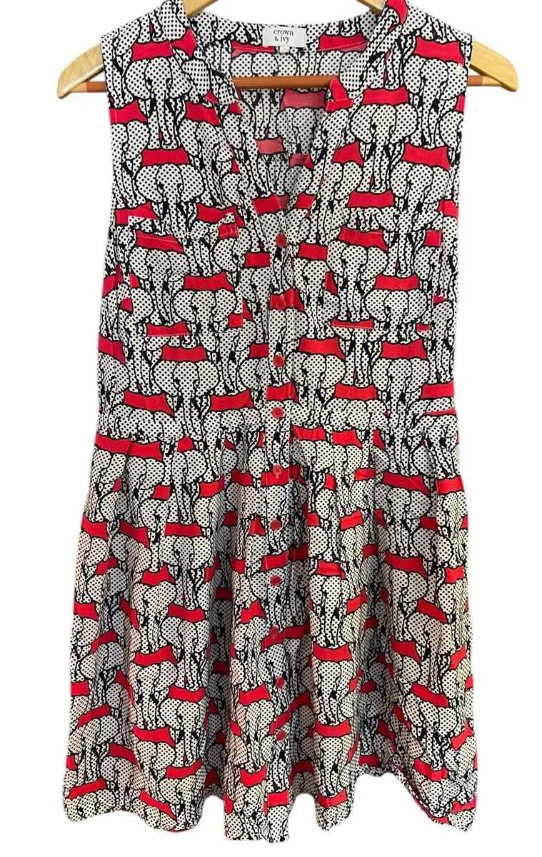 Fun and bold Crown & Ivy sleeveless dress featuring an allover pink, blue, and white polka dot eleph... Show more