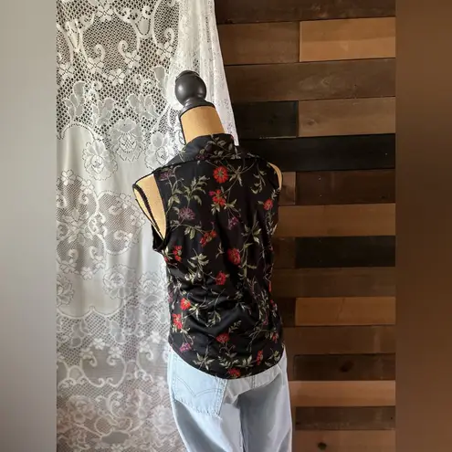 Tagged Size Medium Laying flat approximately 18” ptp 22” length 100% Polyester Update your wardrobe with this Kathy Ireland Sleeveless Black Floral Button-Up Collared Top. Featuring a flattering figure with darting and a mini pocket, this top combines style and practicality. The elegant black floral print and sleeveless design make it perfect for transitioning from summer to fall. Pair it with skirts, pants, or shorts for versatile styling options, and enjoy a chic, comfortable look for any occasion.