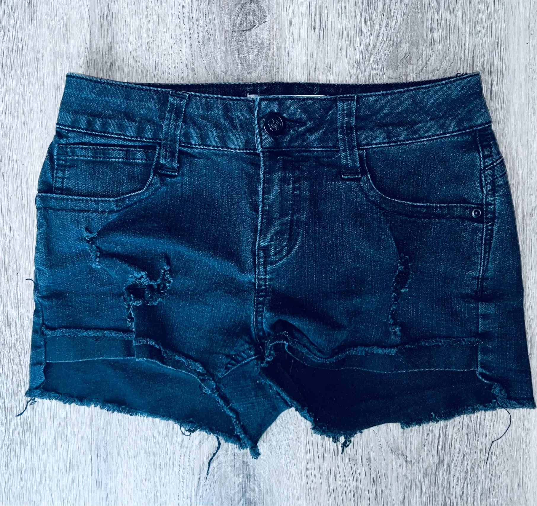 Raw hem black denim stretch shorts with front and button back pockets. Factory faded and distressed.... Show more