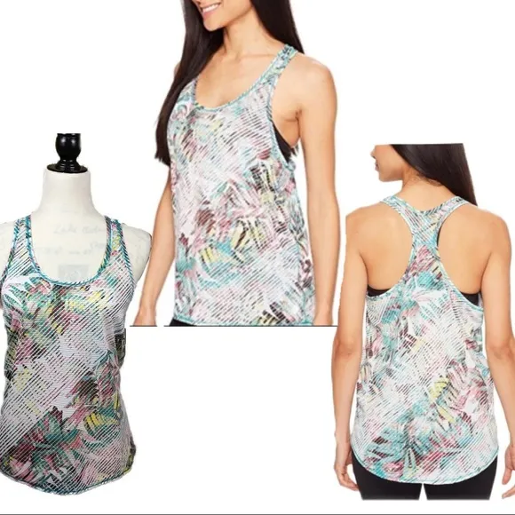 Prana Racerback Tank Top Dragonfly Paradise teal green, white, Yellow, pink. Sheer Stripe fabric Li... Show more