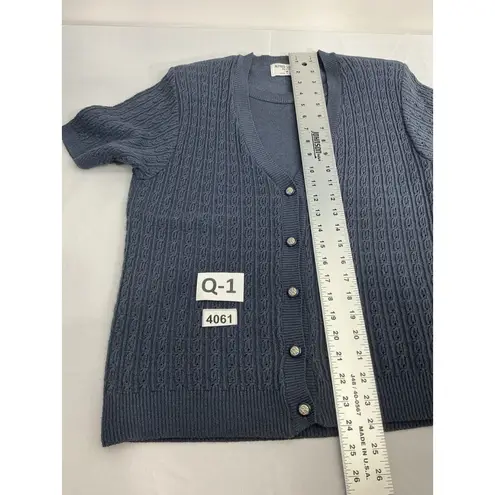 This women's Alfred Dunner petite sweater in medium blue is a versatile 2-in-1 piece featuring a short sleeve design and pullover style that buttons down. The sweater is specifically tailored for petites, making it a great choice for those looking for a comfortable and stylish addition to their wardrobe. The classic blue color and quality brand make this sweater a timeless and elegant option for any outfit or occasion. Made of acrylic/nylon material. Measurements; Pit to pit 19” (38”) Length 24” Arm length 9.5” This sweater is pre owned and looks to be in excellent condition!