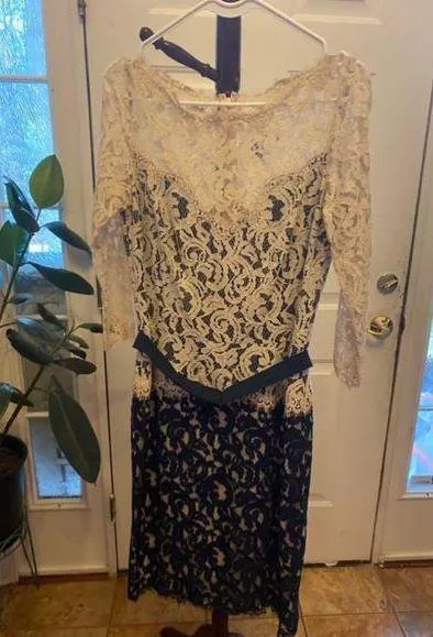 This beautiful Tadashi Shoji dress is perfect for any special occasion. It is made of a delicate blue and white lace and features a fitted silhouette with a flared skirt. The dress has a scalloped neckline and hem, and it comes with a matching belt. It is in excellent condition and has only been worn once.