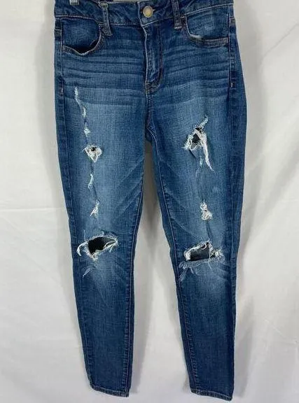 American Eagle Hi Rise Jegging Distressed medium wash, factory fading throughout and distressing 4... Show more
