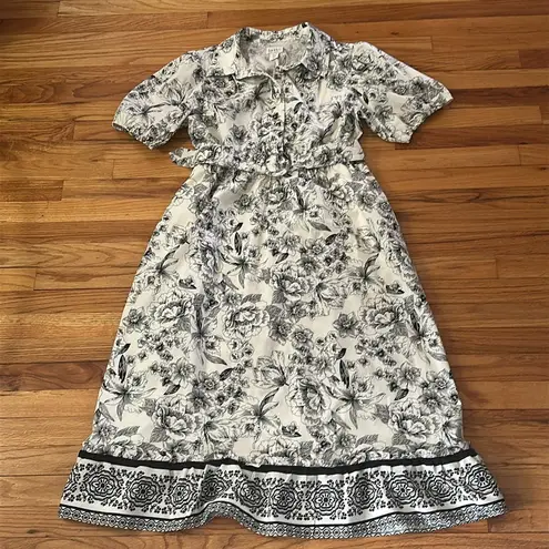 Elegant black and white floral midi length dress perfect for any occasion. Features a black floral p... Show more