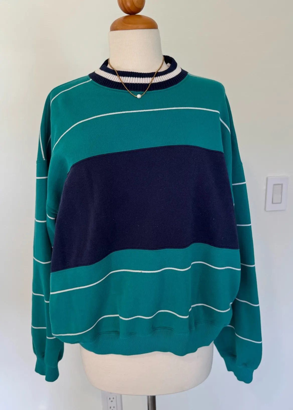 Teal and navy blue vintage Eddie Bauer crewneck sweater with white stripes #preppy #retro Good