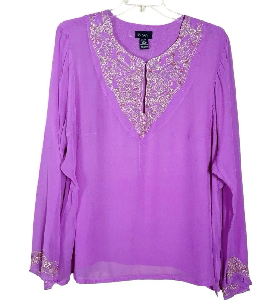 Beautiful pullover sheer purple blouse with gold embellishments at the neckline and cuffs. Rounded n... Show more