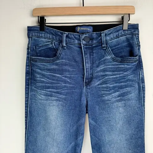 Democracy Womens Jeans Sz 8 Ab solution technology Hidden elastic waistband Dark wash denim Straight leg style Asymmetrical raw hem Fading / whiskering Cotton stretch blend Preowned good condition No flaws Approx Measurements Laying Flat Waist- 15.5” Rise- 10/10.5” Inseam- 24-25” asymmetrical