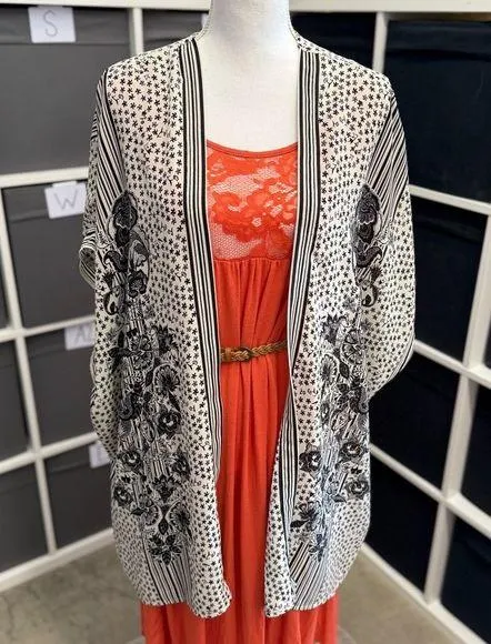 Stylish black and white floral kimono paired with a vibrant orange dress. Perfect for a chic and com... Show more