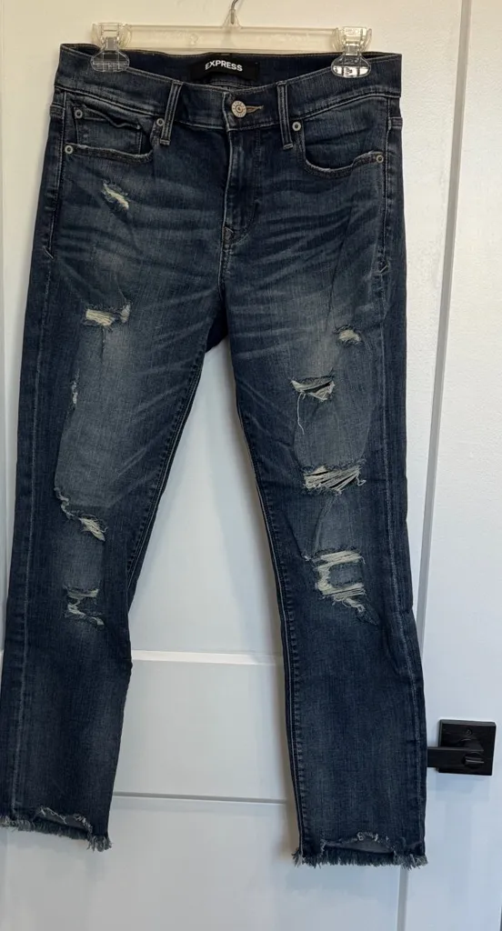 Chic and edgy cropped jeans. Features distressed details. Perfect for casual outings. Stretch skinny... Show more