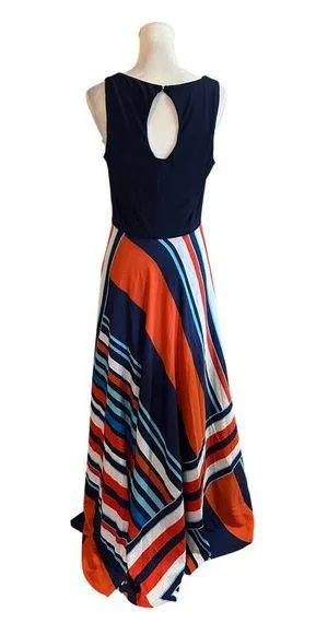 This Eliza J maxi dress exudes a vintage charm with its striking geometric stripes in vivid hues. The sleeveless design and keyhole back offer a timeless elegance, reminiscent of days gone by. The combination of colors and patterns evokes a nostalgic yet sophisticated aura. • Sleeveless design for effortless style • Keyhole back closure for added detail • Multicolor geometric stripe pattern • Floor-length maxi style • Concealed side zipper