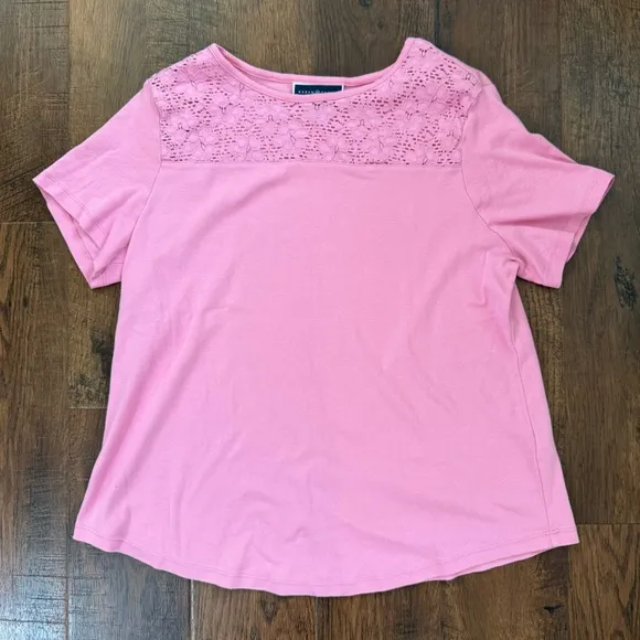 Authentic KAREN SCOTT pink short sleeve tee shirt, plus size 1X In gently worn condition. Pretty open lace detailing at top. Light swing style for comfortable fit. Measurements are approx and not exact. Color may vary based on lighting. Please review all image and ask questions prior to purchase.