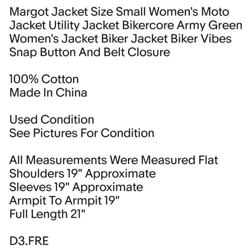 Margot Jacket Size Small Women's Moto Jacket Utility Jacket Bikercore Army Green Women's Jacket Biker Jacket Biker Vibes Snap Button And Belt Closure 100% Cotton Made In China Used Condition See Pictures For Condition All Measurements Were Measured Flat Shoulders 19" Approximate Sleeves 19" Approximate Armpit To Armpit 19" Full Length 21" D3.FRE