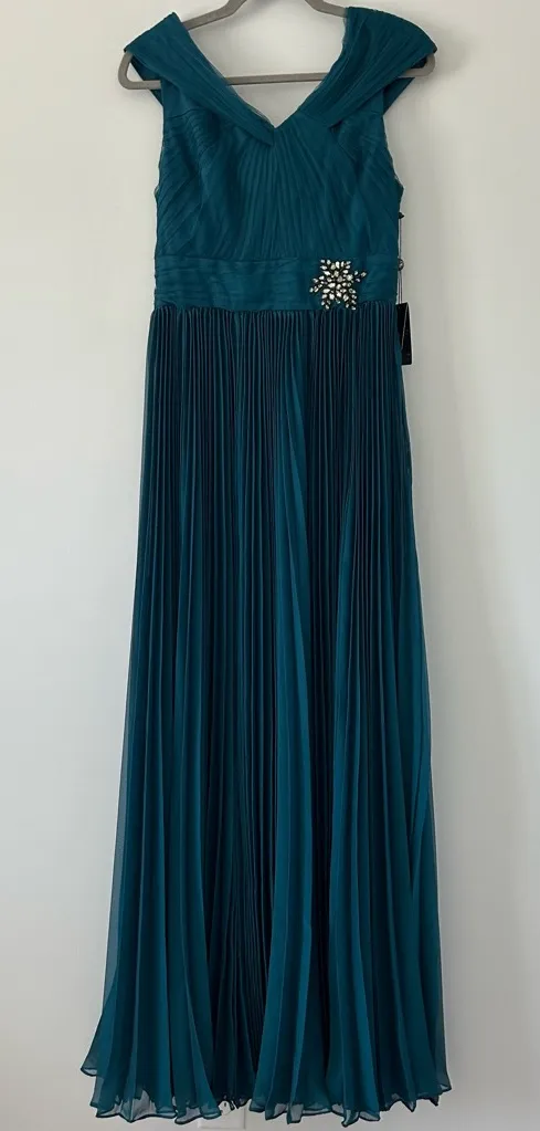 Adrianna Papell Teal Blue Shirred Caplet Embellished Pleated Skirt Gown New with tags Size 8 Color... Show more