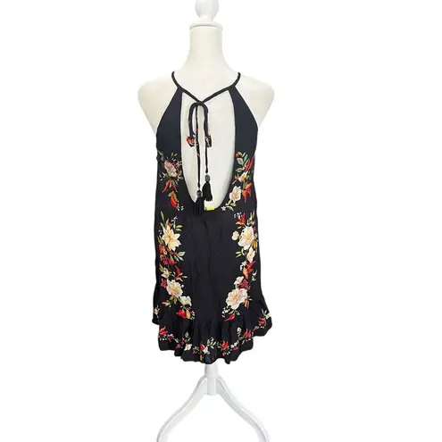 Beautiful black sleeveless mini dress by Farm Rio featuring vibrant floral embroidery down the front and hemline. Designed with a halter neckline, open back with tassel tie detail, and feminine ruffled hem. Perfect for warm-weather events, vacations, or summer parties. • Brand: Farm Rio • Size: Medium • Color: Black with multicolor floral embroidery • Style: Sleeveless mini dress, halter tie back, open back, ruffle hem • Material: Lightweight woven poly blend (no stretch) • Care: Dry clean recommended • Condition: Excellent pre-owned Approx. Flat Lay Measurements • Pit to Pit: 17” • Length: 32” ✨ Standout boho-chic style from Farm Rio — bold, bright, and fun! Farm Rio dress, embroidered mini dress, black floral dress, ruffle hem dress, boho summer dress, festival dress, resort wear, open back mini dress, tassel tie dress, vacation outfit