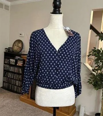 Kendall & Kylie Button Up Long Sleeve Indigo Ditsy Crop Top Blue Size L NWT Vneck Button down shirt... Show more