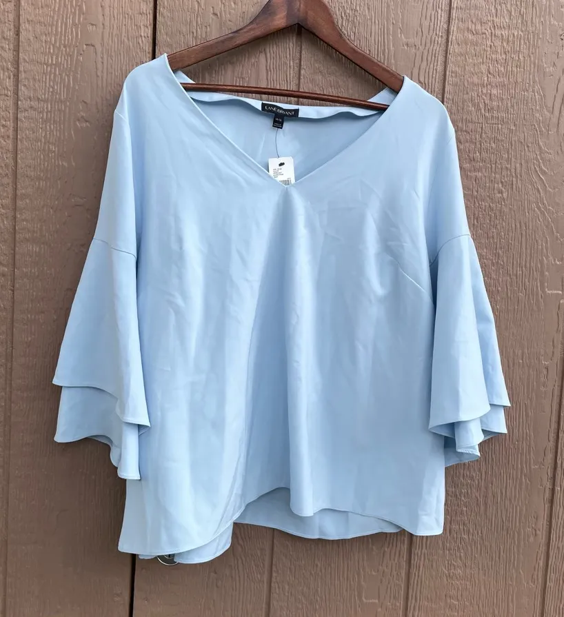 NWT Lane Bryant Womens Shirt Blouse Light Blue V Neck Tiered Flare Sleeve 14/16 Womens Plus Size 14... Show more