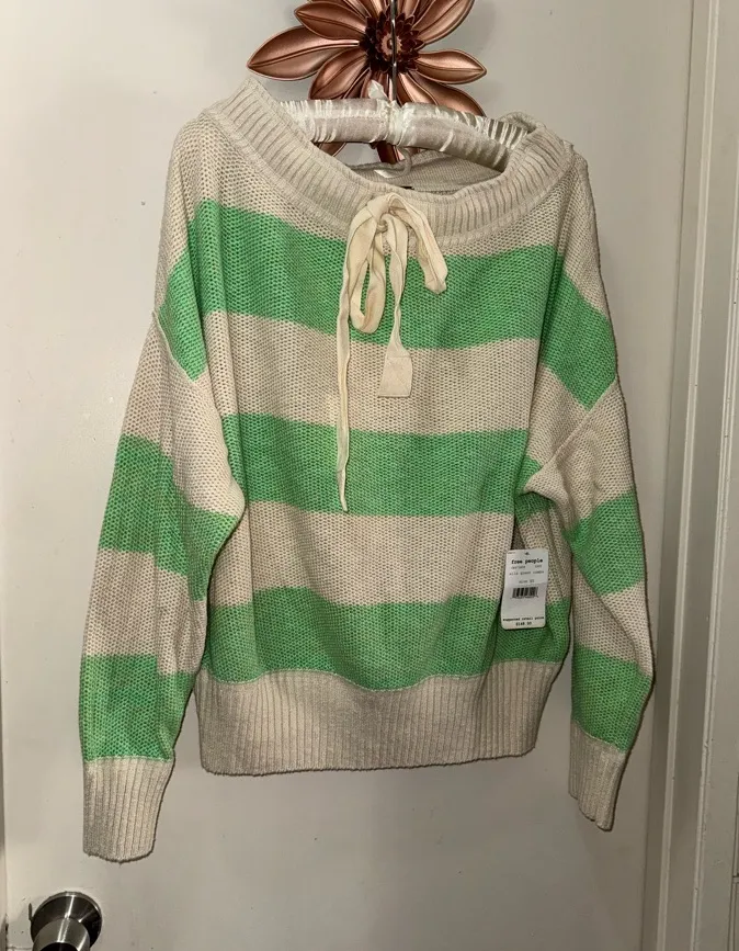 Chic crew neck sweater with mint and cream stripes. Features a playful tie detail. Ideal for casual... Show more