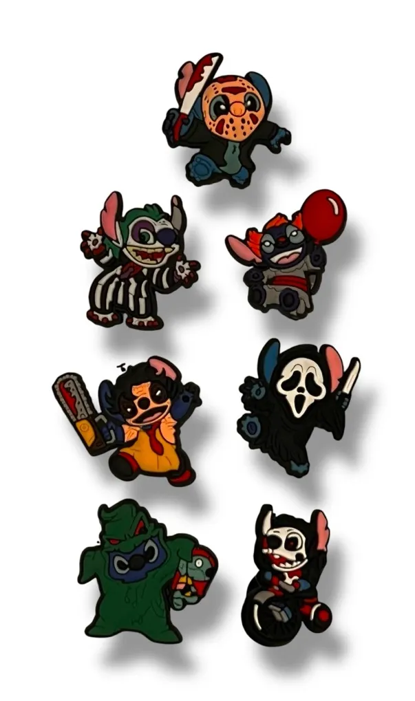 This 7 pack of charm jibbitz for crocs feature the Stitch character in various Halloween costumes from popular horror movies. Jason, Freddie, scream, It, Beetlejuice, etc *colors may vary due to lighting or viewing devices