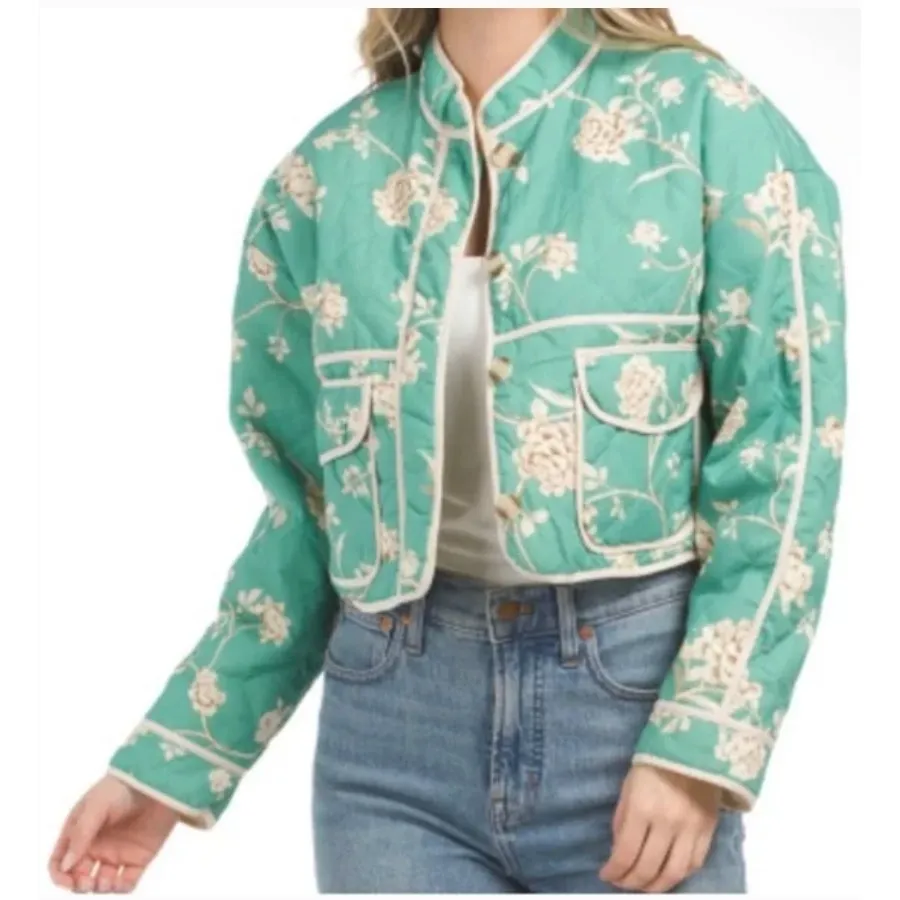 7 For All Mankind Diamon Quilted Jacket in Green Floral Print Quilted cropped jacket with front but... Show more