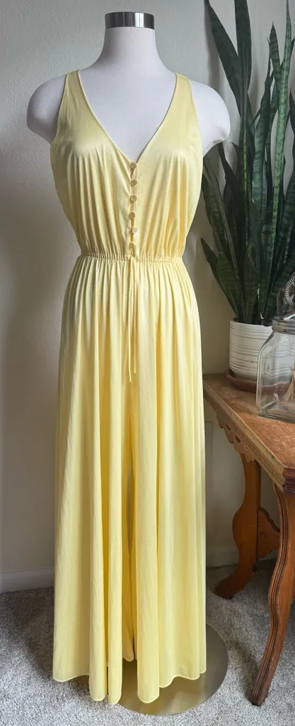 Elegant vintage wide-leg jumpsuit in soft butter yellow satin-like fabric with pearl buttons and dramatic flow. Union made in USA. Andie Anderson energy, rom-com energy. – Color: Butter Yellow – Pattern: semi-sheer (see picture) – Material: Nylon blend likely-no material tag – Style: Sleeveless Wide Leg Jumpsuit – Size: M (based on measurements, no tag) – Occasion: Editorial, Resort, Summer Party, Romcom Core Could fit sizes: medium or a small with a relaxed fit — please see measurements Measurements: Bust: 34” Waist stretches to: 36” (full stretch 42”) Hip: 42” Inseam: 26” Length: 57” Tags: romcom core, vintage yellow jumpsuit, union made, wide leg resortwear, bridal shower outfit, retro glam, 70s jumpsuit, editorial piece, festival, concert Pet-free/Smoke-free home. Thank you for taking the time to look.