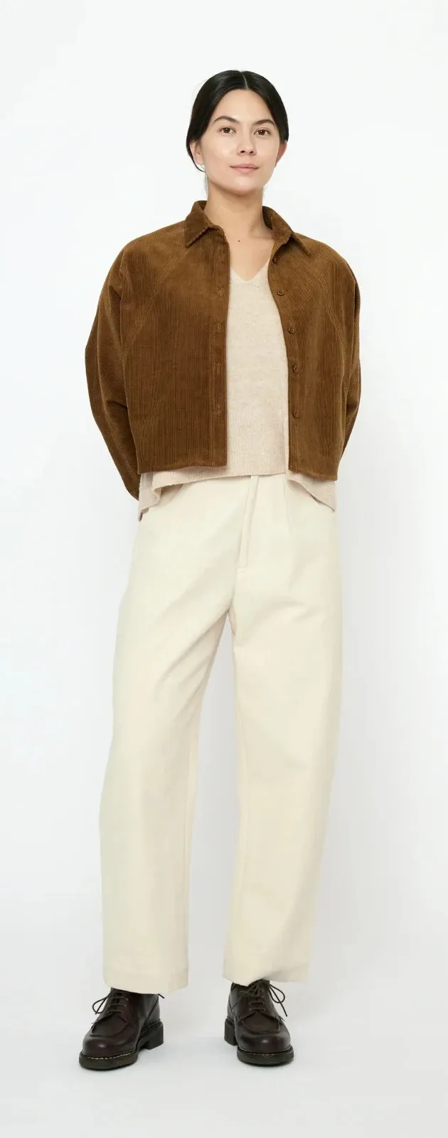7115 by Szeki Corduroy 3/4 Cropped Shirt Jacket in Sepia Brown Size Medium A thoughtfully tailored shirt jacket. Features a generously boxy fit, cropped length, dolman sleeves and a button placket. Paneled construction and a pleated hem. $222 retail A standard wale cotton corduroy with a soft ridged surface. Durable and breathable, perfect for day-to-day wear and transitional seasons. Features a roomy and boxy fit across the bust and has a generous cut so the shirt can be worn unbuttoned as a jacket. 15831