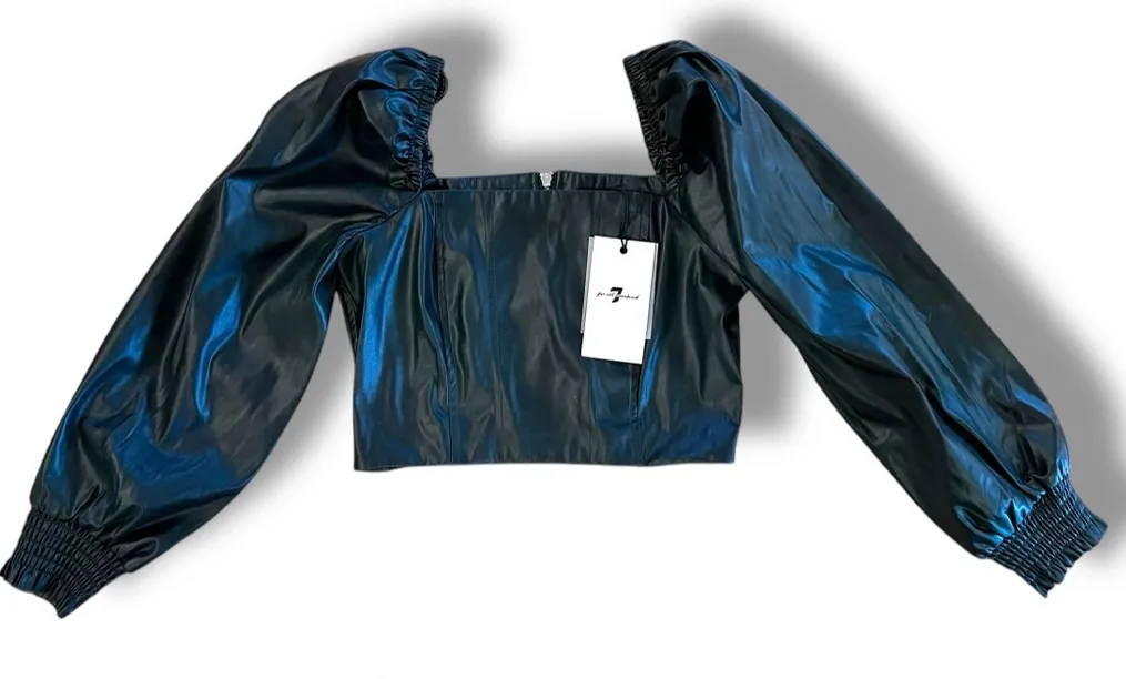 Black Faux Leather Crop Top Brand: 7 for All Mankind Size: XS Style Name: None Color: Hunter Green NWT Retailed for $228 Vegan leather finish Wet look Smocked cuffs Long sleeve Blouson sleeve Square neck Cropped length Armpit to armpit: 14.25" Top to bottom: 13.75" Shell: 100% Polyurethane Backing: 100% Polyester Smoke-free home **All measurements are taken laying flat. Please note that these measurements are approximate based upon my measurements
