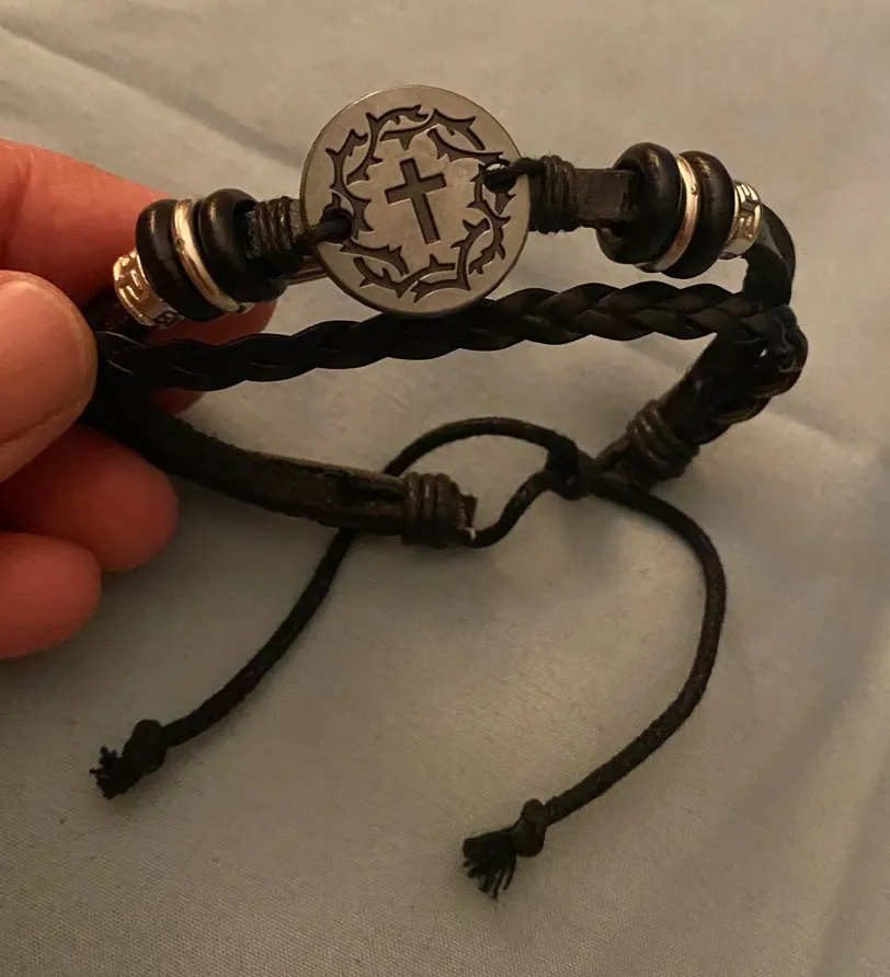 Stylish black braided bracelet featuring a cross charm. Perfect for adding a touch of elegance to any outfit. Great condition with no damages Silver tone pendant No precious metals Adjustable cording and faux black leather bands
