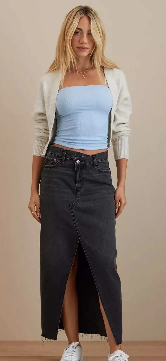 Embrace effortless style with this striking charcoal grey denim maxi skirt. Its daring high slit creates captivating movement with every step, while the raw, frayed hem adds a touch of edgy coolness. Perfect for a casual brunch with friends or a night out on the town, this skirt offers a chic and confident look. Measurements: • Waist: 14" • Hips: 18" • Length: 35" • Slit Length: 19" Type: Skirt Style: Maxi Skirt Length: Long Department: Women Material: Denim Pattern: Solid Accents: Zipper, Fringe Fabric Type: Denim Features: Slit, Pockets Closure: Zip Rise: High Occasion: Casual, Party/Cocktail Keywords: American Eagle skirt, denim maxi skirt, charcoal grey skirt, high slit skirt, raw hem skirt, distressed denim, women's skirt, long denim skirt, fashionable skirt, casual skirt, evening skirt, trendy skirt, streetwear skirt