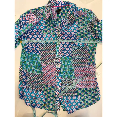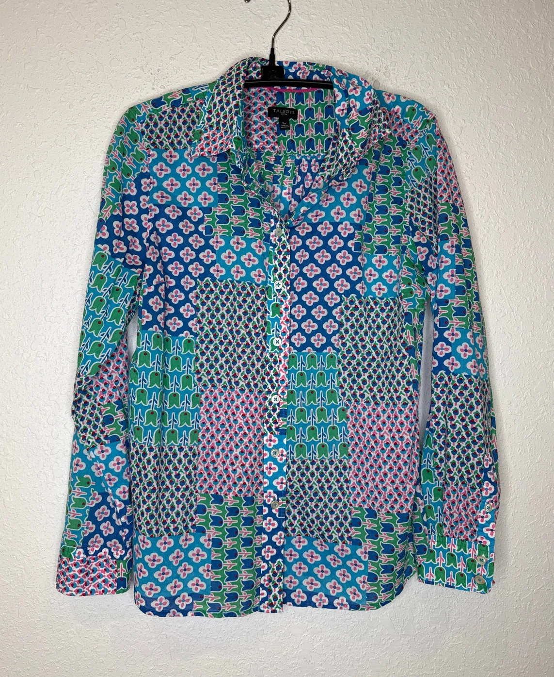 This Talbots vibrant and breathable multicolor patchwork tulip:floral/geometric all over print shirt... Show more