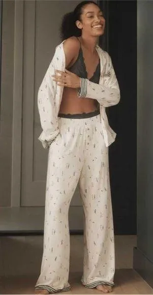 Soft stretchy button down long sleeve top Elastic waist pants with pockets Excellent condition