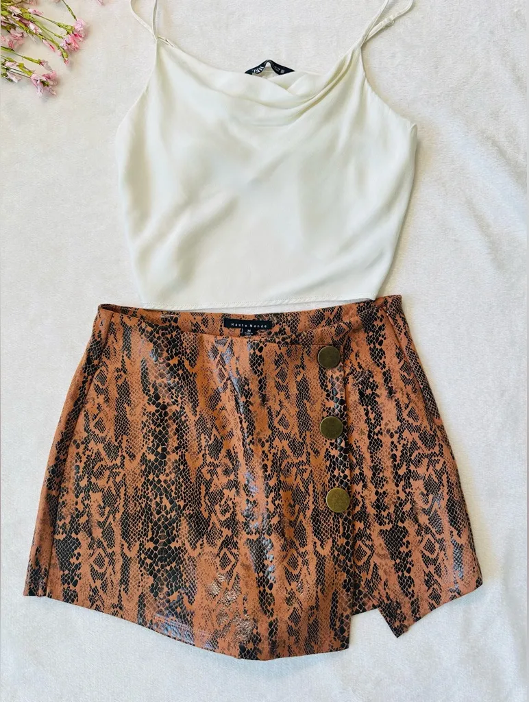 Chic tan snake print skirt with button detail. Perfect for stylish outings.