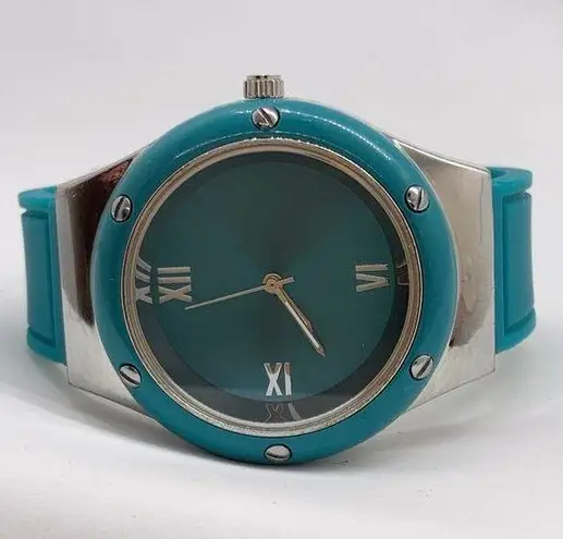Darice ladies Quartz analog watch 41mm silver tone case dark aqua dial band runs - $10 - From Watch