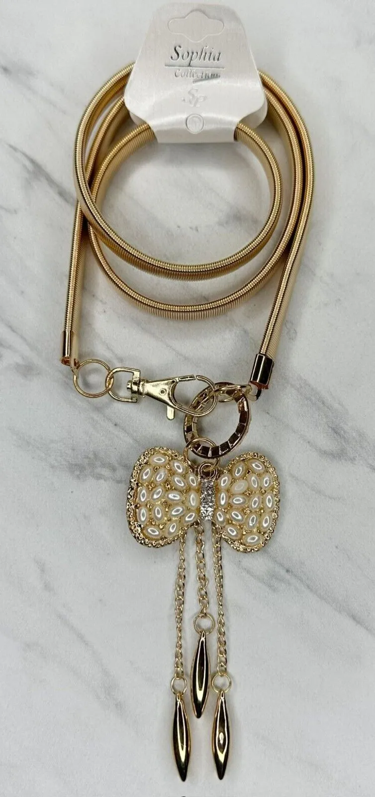 Brand: Sophia Collection 📏 Size: XS/Small (XS/S) 🤍 Color: Gold Tone 👗 Style: Stretch Cinch Belt This gorgeous stretch belt is absolutely stunning! The rhinestone bow with faux pearls and dangling chain details adds such an elegant touch to any outfit. Details: - Length: 28" (stretches to 33") - Coil width: 0.36" - Weight: 2.9 oz - Gold tone coil construction - Rhinestone bow with faux pearl accents - Dangling chain details Condition: New with tags - never worn Perfect for cinching dresses, adding glamour to cardigans, or creating that perfect hourglass silhouette! B4918