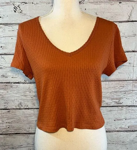 Gently used rust colored cropped knit V neck top. Neckline has crocheted trim and fabric is textured... Show more