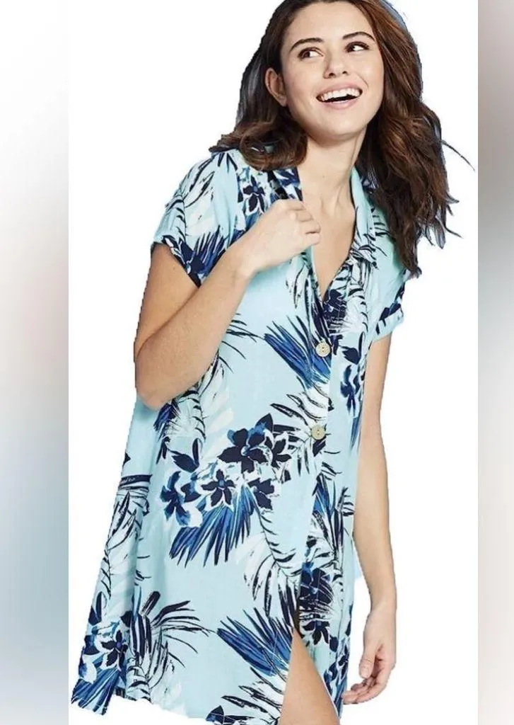 Stylish swim coverup with floral design. Button-down front. Short sleeves. Perfect for beach days.