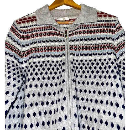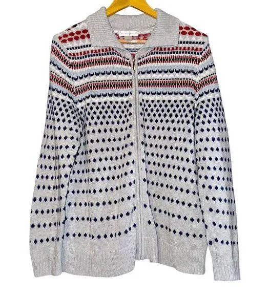 Christopher Banks Full Zip Cardigan Sweater Fair Isle Print Women's Size L Pit to Pit 23" Length 28" Gray with Blue, Red, Green and White Christmas, Holiday, winter, Fall, Fair isle, warm Good Pre-Owned Condition with minor wash wear