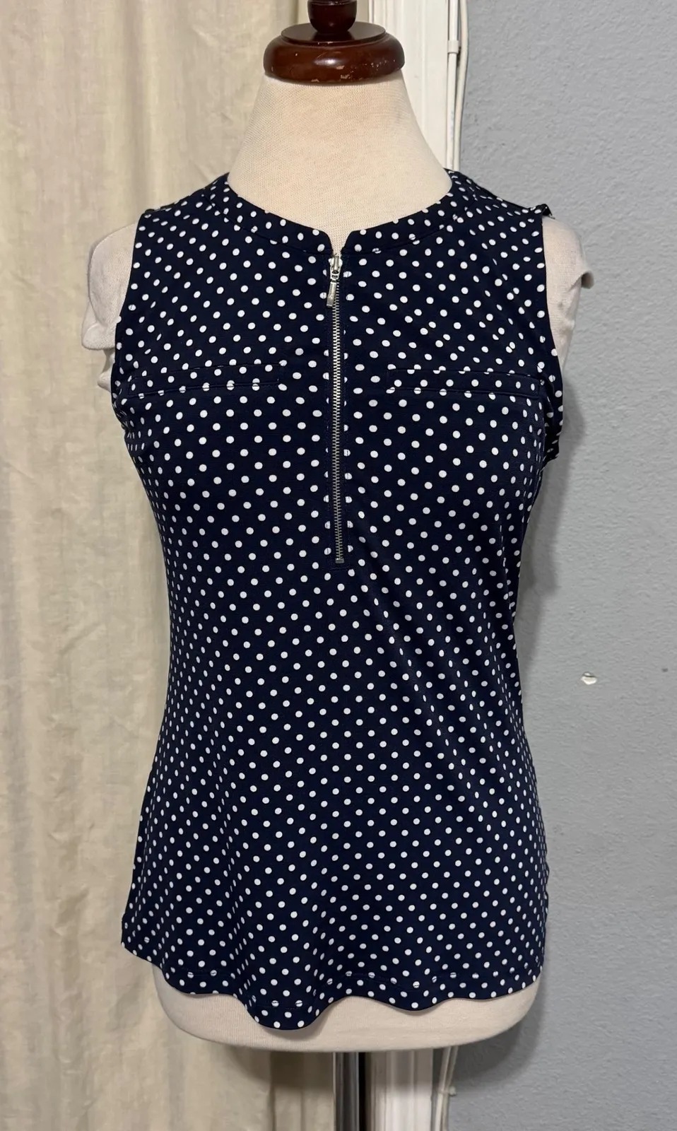 A navy and white polka dot sleeveless top by 7th Avenue Design Studio. This top features a flattering fit with a zip-neck closure and decorative chest pockets. Perfect for casual outings or a business casual setting. Preowned - Good condition Measurements: • Bust: 17 in • Length: 25 in Type: Tank Department: Women Material: Polyester, Spandex Neckline: Mock Neck Sleeve Length: Sleeveless Sleeve Type: Classic/Fitted Sleeve Pattern: Polka Dot Accents: Zipper Features: Pockets, Stretch Fit: Slim Fabric Type: Knit Occasion: Casual, Workwear Closure: Zip Season: Spring, Summer, Fall Keywords: polka dot top, sleeveless top, zip neck, women's top, casual wear, workwear, summer top, petite, lightweight, fashion top, navy top, white polka dots, collarless, chest pocket detail