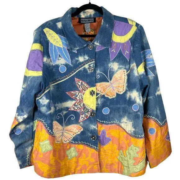 Size: 1X Style: Jacket coat casual comfy hipster trendy layering embellished embroidered boho bohemian hippie art to wear wearable art shacket shirt jacket patch work patchwork butterfly Measurements: Pit to pit: 25 inches Sleeve: 24 inches Length: 27 inches All measurements are approximate. To ensure a good fit, it is recommended that you compare these measurements with a similar piece that you own. Condition: Pre-owned, good used condition. See photos Always open to reasonable offers! Bundle for the best deals! FYI all items come from a non-smoking but pet friendly home. Super fast shipping: We ship items within 48 hours of purchase!