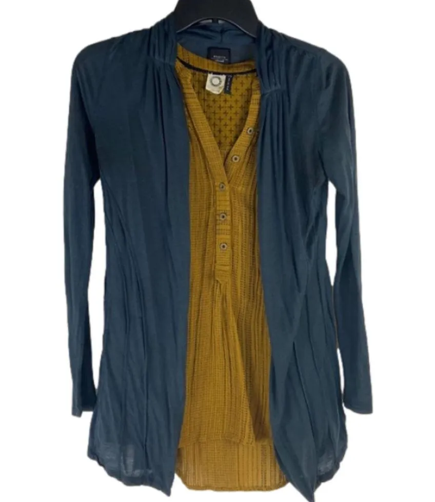 Anthropologie brand Deletta dark gray pleated lightweight long sleeve wrap. Perfect all weather layering top. Asymmetric hem, longer in front. *Anthro Akemi +Kin sleeveless Shirt sold separately Women’s size XS. Excellent preowned condition. Clean, smoke free home. Five star seller. Super fast shipping! Measurements 17” armpit to armpit 29” front and 23.5” back length *measurements are approximate Versatile Cottagecore Normcore Minimalist Natural SKU# 23771 02