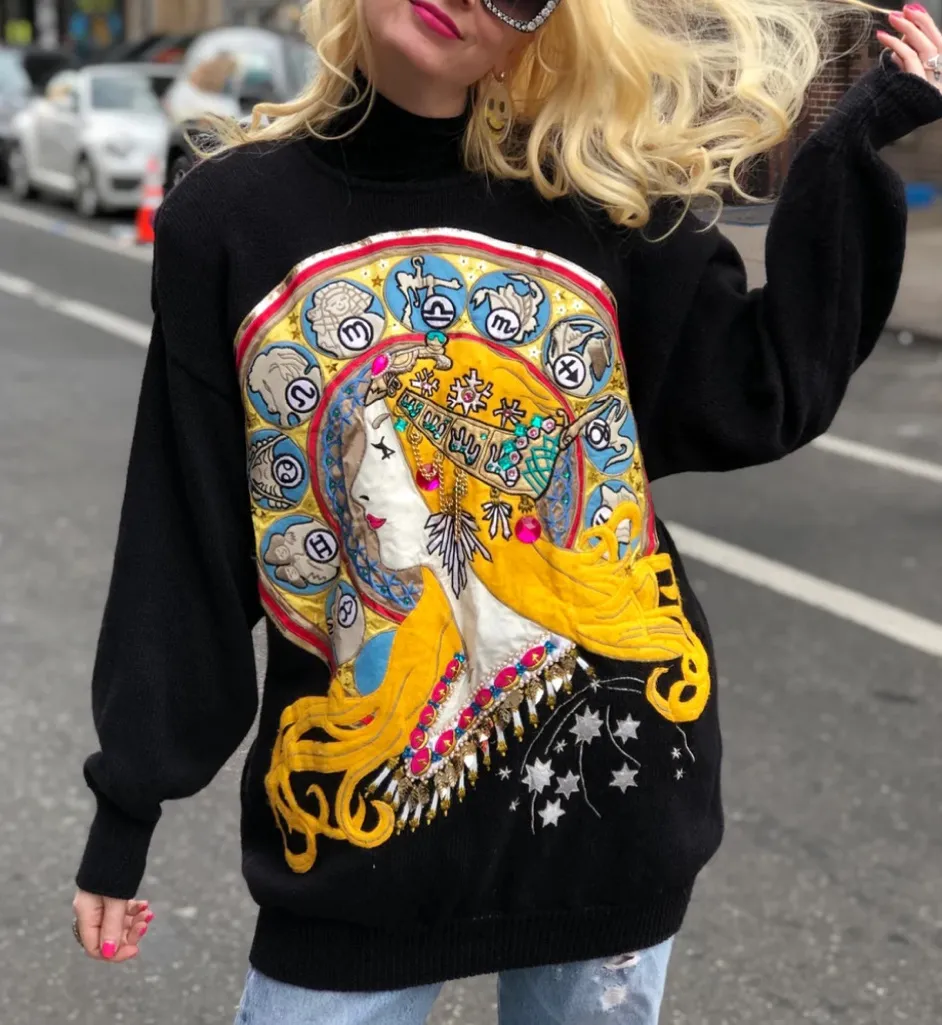 Authentic 1980s vintage statement sweater by Bonnie Boerer Company. Black knit pullover featuring an ornate hand-appliqué zodiac astrology goddess motif with metallic accents, beadwork, embroidery, and vivid graphic detailing. Bold artwear design with oversized 80s fit, ribbed cuffs and hem, and dramatic celestial imagery. Soft knit body with structured weight, perfect as a collectible vintage sweater or standout statement piece. True vintage construction with no modern reproductions. Excellent preowned vintage condition with light age-consistent wear. Missing a couple of gold leaves. I have 1 whole one that came off and 1 that broke in 2. Size: S OVERSIZED Approximate Measurements (laid flat): Bust: 23” Length: 32” Made in Macau. Smoke-free, dog-friendly home. 80s vintage sweater, bonnie boerer sweater, vintage art sweater, astrology sweater, zodiac sweater, celestial sweater, goddess sweater, statement knit, vintage novelty sweater, 1980s fashion, vintage black sweater, oversized vintage sweater, vintage beaded sweater, embroidered sweater, collectible vintage clothing, artwear sweater, vintage graphic knit, celestial fashion, astrology fashion, boho vintage sweater, eclectic sweater, museum worthy vintage, rare vintage sweater, statement pullover, slouchy vintage sweater, retro fashion sweater, vintage couture knit, 80s art fashion, celestial artwear, zodiac fashion sweater